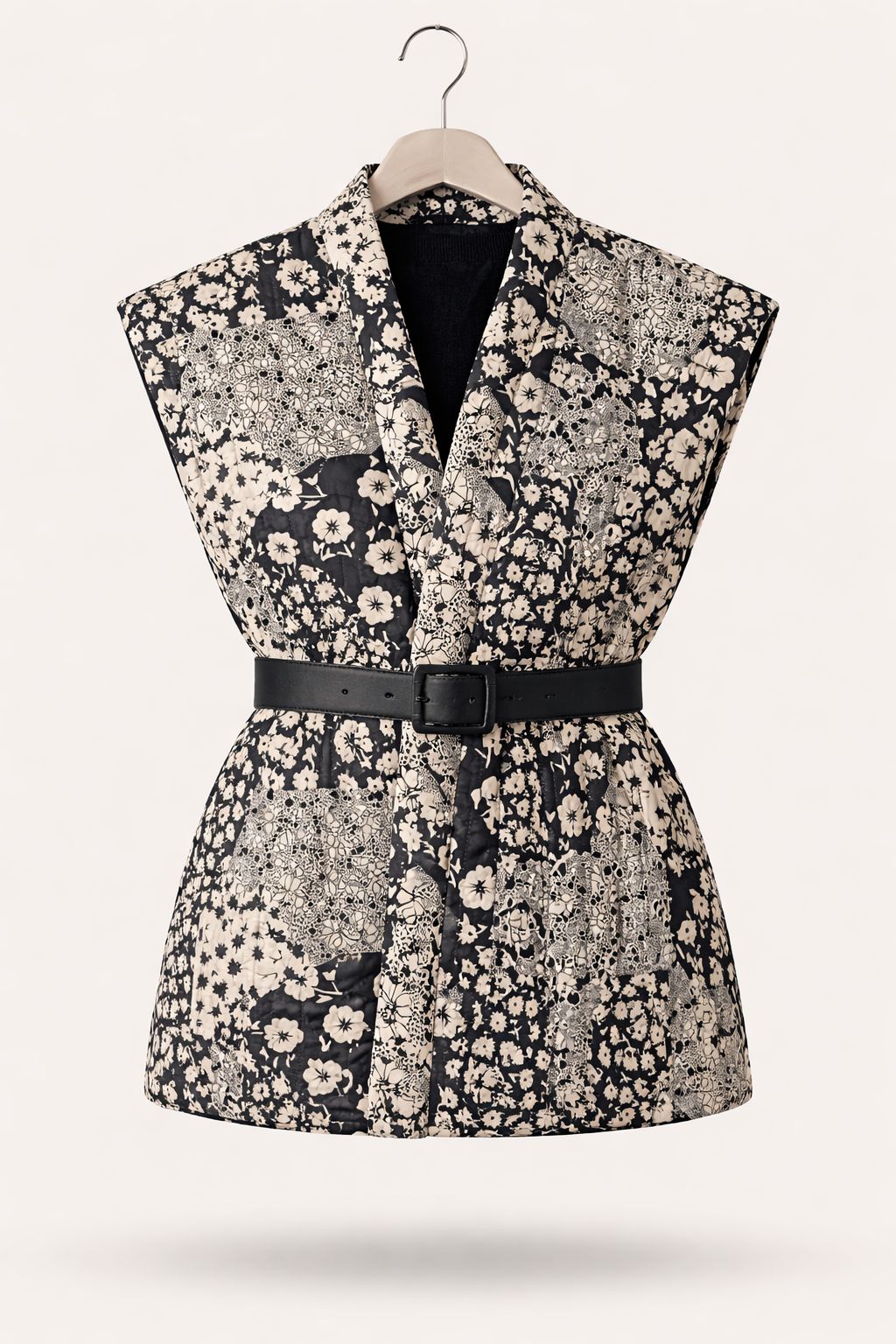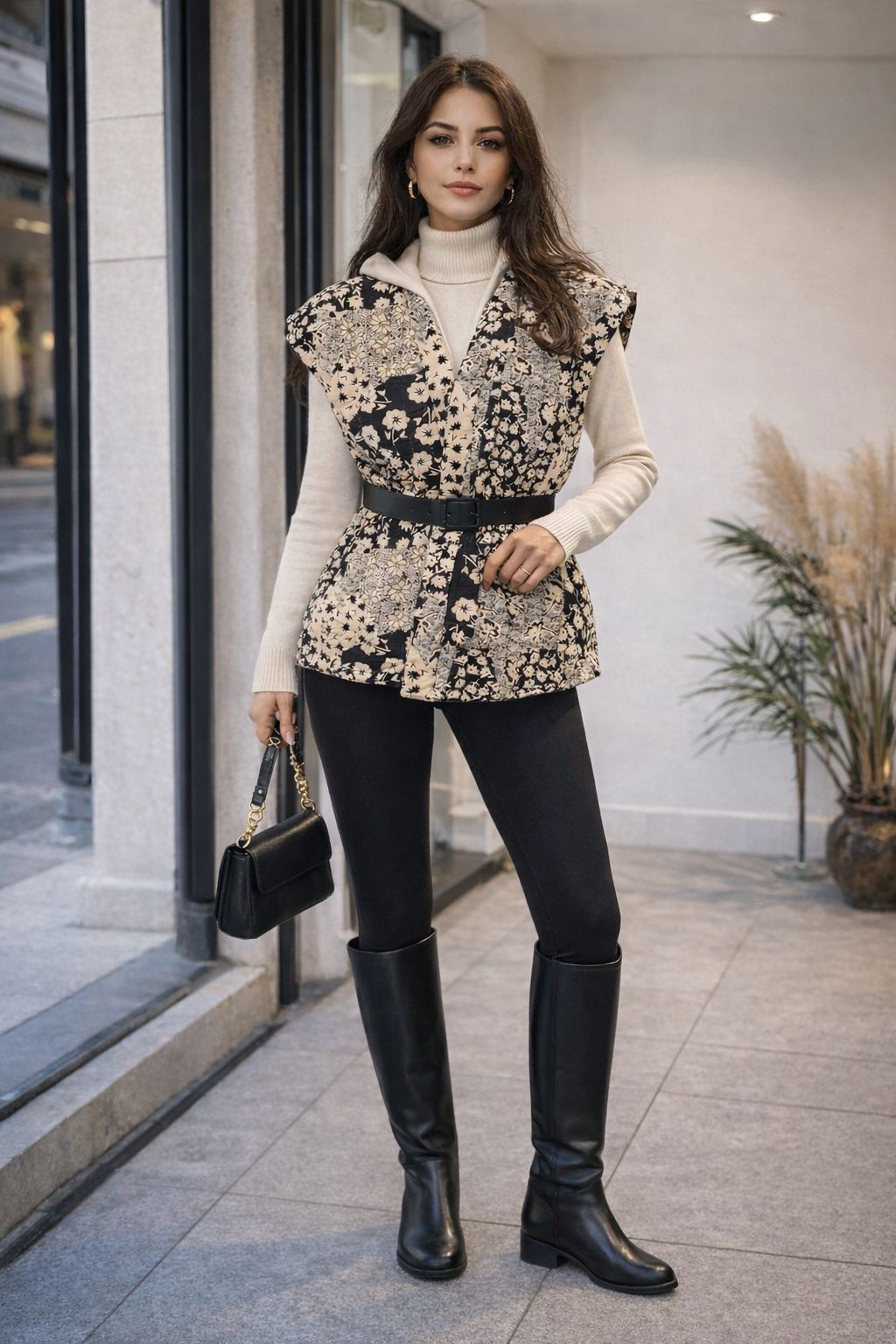 Zarif çiçek desenleriyle süslenmiş şık yelek, kombinlerinize sofistike bir dokunuş katar. Kemer detayı ile vücuda oturan kesimi sayesinde modern ve feminen bir görünüm sunar.